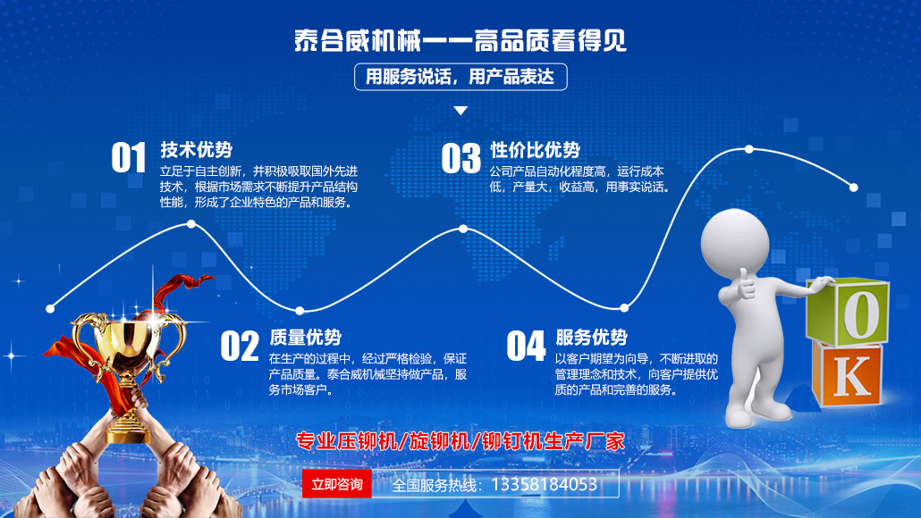 湖北市royal皇家88集团 机械厂全体员工,立足于自主创新,并积极吸取国外先 进技术,根据市场需求不断提升产品结构性能,形成了企业特色的产品和服务。 在全公司员工的共同努力下,所研发生产的铆钉机、气动旋铆机设备受到了市场客户的欢迎和信赖。铆钉机、气动旋铆机在生产的过程中,经过了严格的检验,保证产品质量。湖北市royal皇家88集团 机械厂坚持做产品,服务市场客户。在发展的过程中,立足市场需求,坚持改革创新,提高全体员工的整体素质。